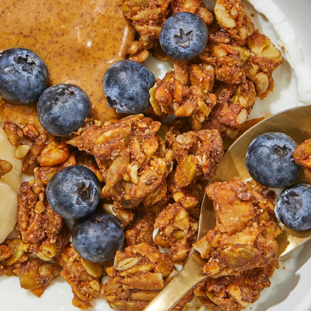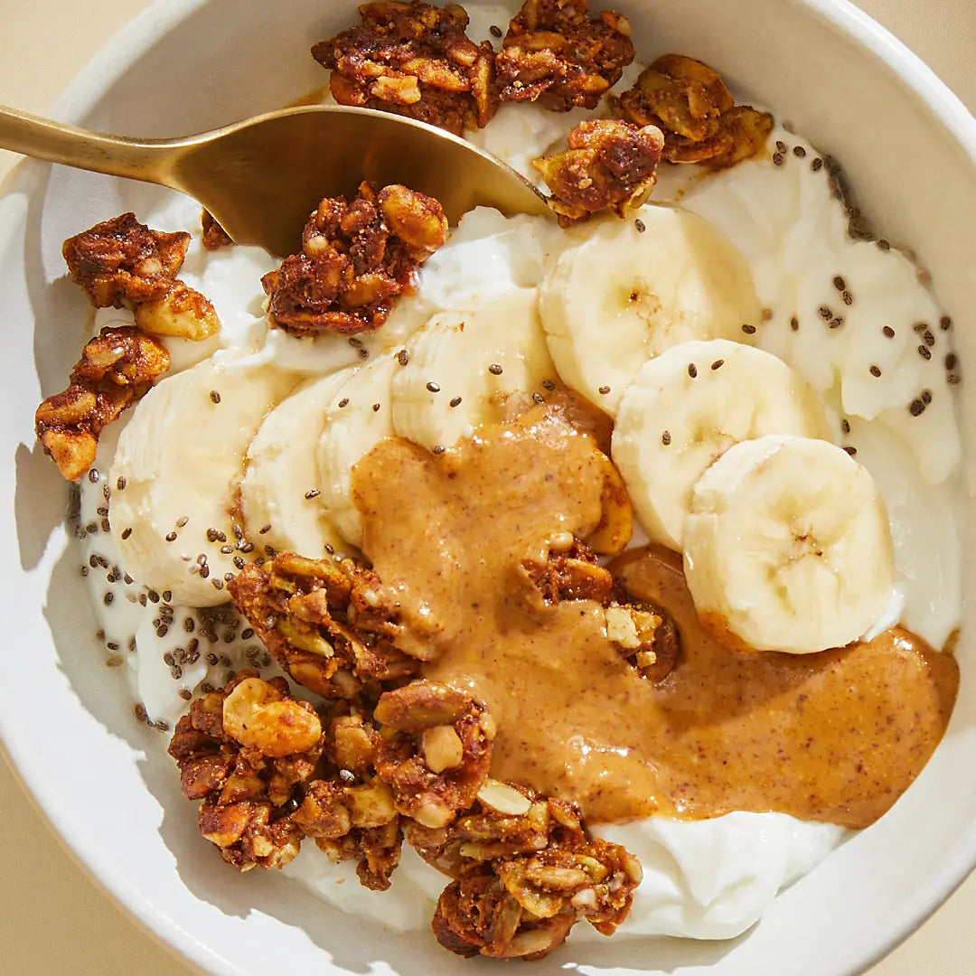 - Top air fried banana with a dollop of yogurt, a drizzle of peanut butter, and Purely Elizabeth Grain-Free Granola.